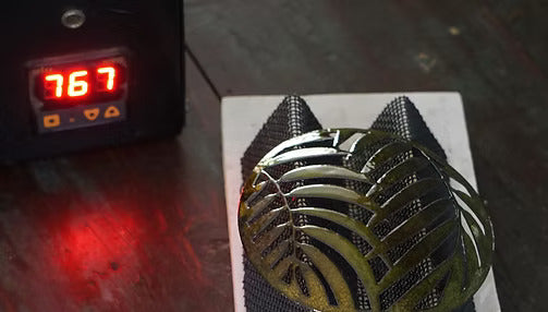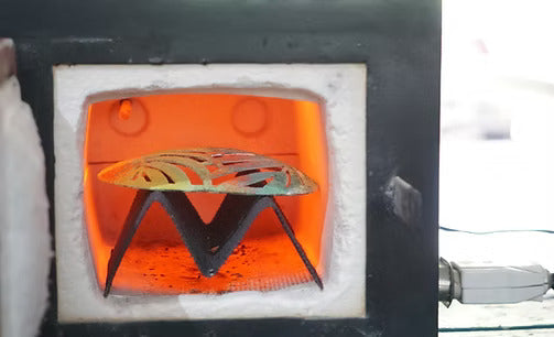 The material used by The Joyful Enamelist is called Vitreous Enamel, which is made by fusing glass to a substrate at the temperature of 750 degree Celsius and 850 degree Celsius. The vitreous melts and sticks to the metal, resulting in a durable coating.